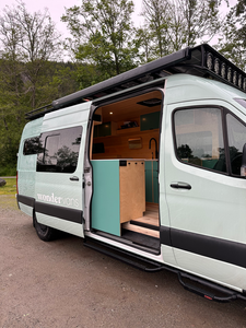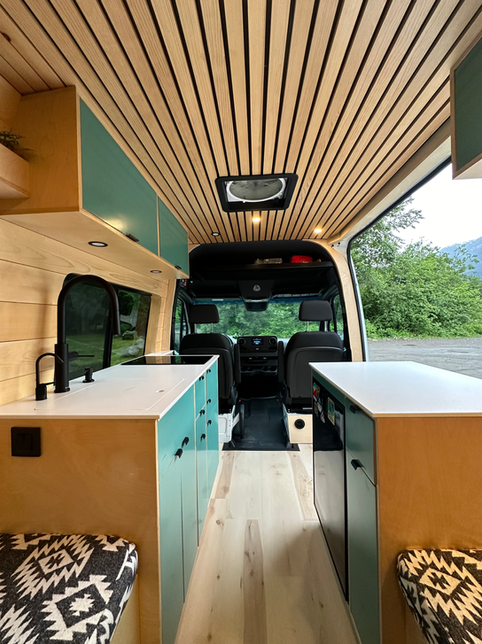 Wonda was our show van from 2022 to 2024, she features a unique wood interior with slatted ceiling, colourful cabinets and LOTS of storage! Perfect for adventurers with lots of gear the bed goes up and down on electric actuators for a flexible storage solution! Lots of windows for the summer, and heated floor in the winter this van is perfect all year round!
